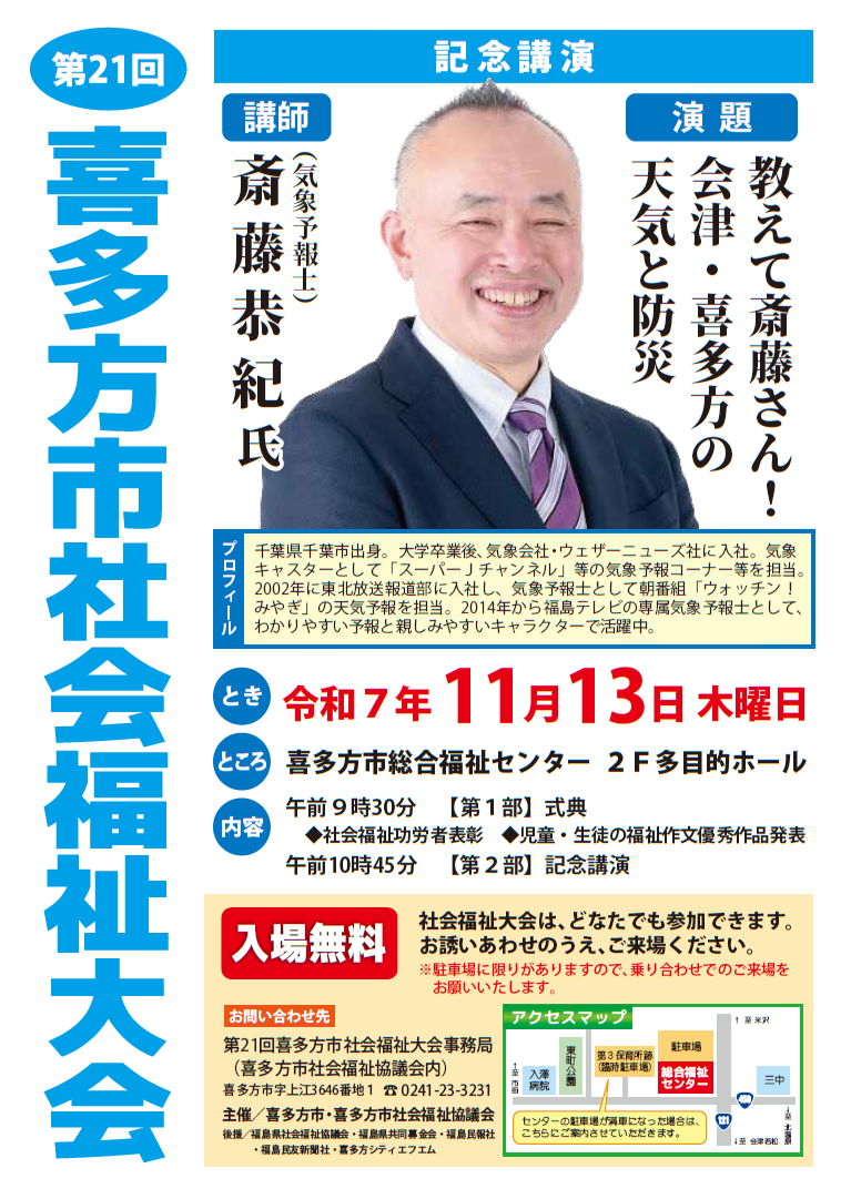また、記念講演として福島テレビ専属気象予報士の斎藤恭紀さんにご講演いただきます。入場は無料(予約不要)ですので、皆様お誘いあわせのうえ、ご来場ください。